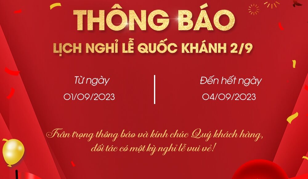Kính gửi: Quý khách hàng, đối tác Công ty Luật TNHH Nam Dương xin trân trọng thông báo đến Quý khách hàng, đối tác thời gian nghỉ lễ Quốc khánh 2/9/2023 như sau: Thời gian nghỉ lễ: Từ ngày 01/09/2023 (Thứ sáu) đến hết ngày...